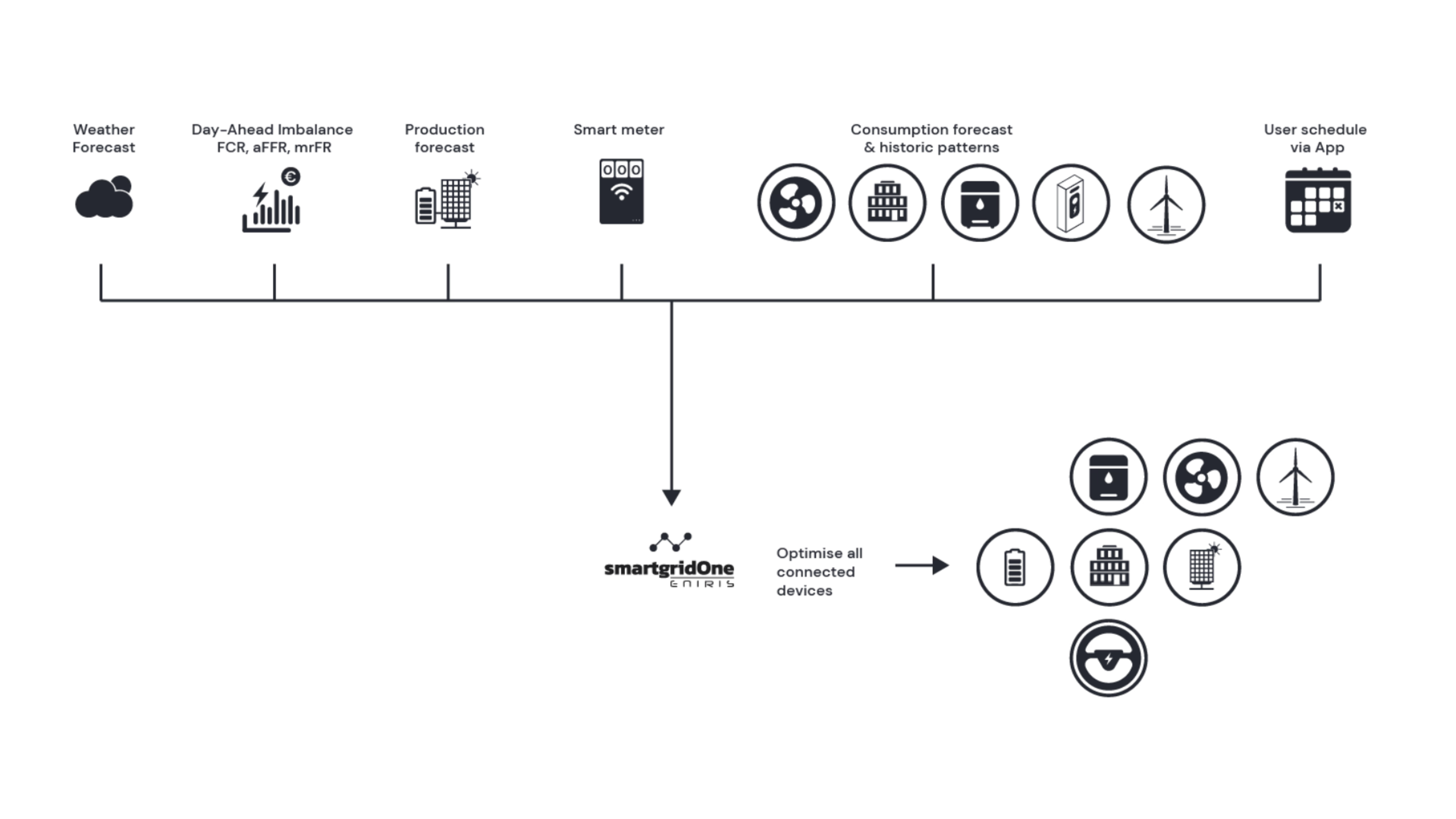 SmartgridOne ist ein modernes Energiemanagementsystem, das elektrische Anlagen – darunter Batteriespeicher, PV-Anlagen, Ladestationen, Wärmepumpen und Lasten – intelligent vernetzt, steuert und optimiert. Dabei kann die Lösung lokal über ein Gerät oder über die Cloud betrieben werden.